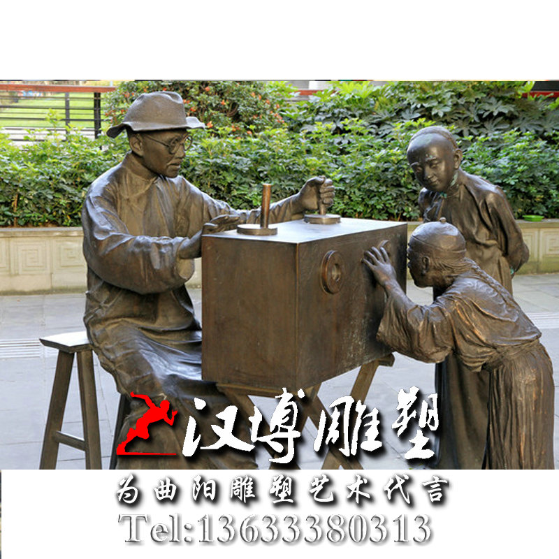 名称:民俗文化雕塑 玻璃钢仿铜人物雕塑 看西洋镜雕塑 广场景观雕塑